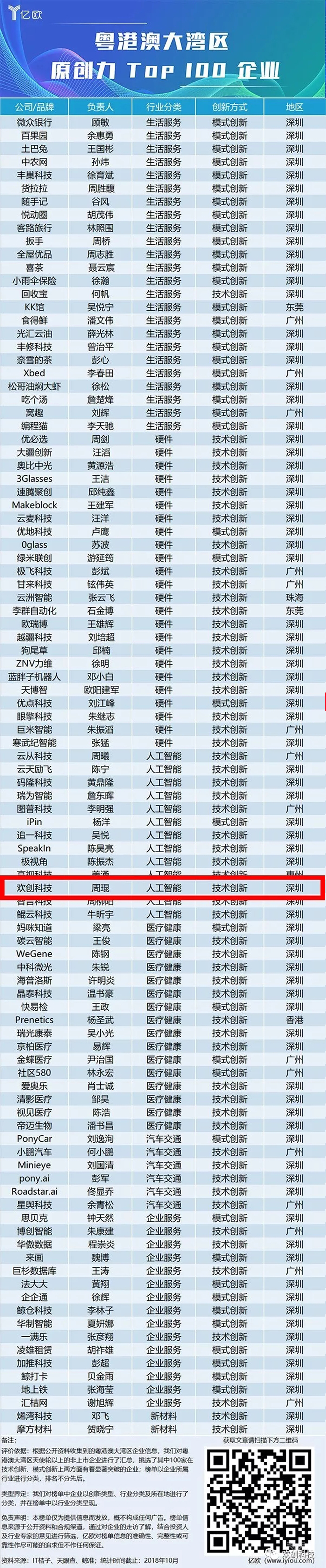 2018年10月18日,億歐在“2018粵港澳大灣區國際科創”峰會上,現場發布了“2018年粵港澳大灣區原創力百強企業”榜單。以此鼓勵和表彰具有原創精神和原創能力的科創企業,引導社會從單純關注融資轉向支持原創。歡創科技因其出色的自主創新能力榮登2018年度“粵港澳大灣區原創力”榜單。